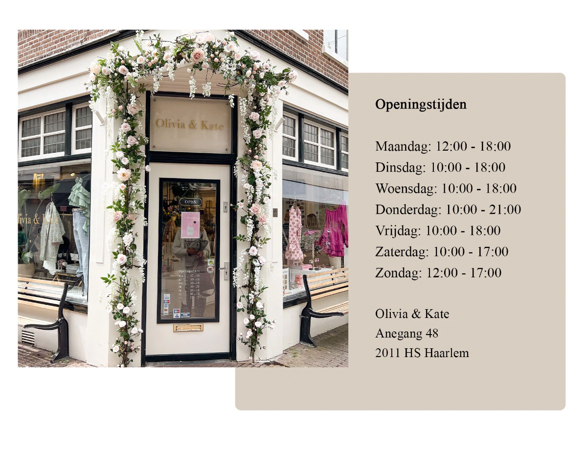 Olivia & Kate is ontstaan uit een droom van Janina, de eigenaresse, om een eigen winkel te beginnen in Haarlem. Zij wilde een plek creeeren waar je niet alleen kleding kan kopen, maar een lifestyle. Daarom kan je in de winkel dan ook alles kopen, een complete outfit van kleding tot schoenen en sieraden, maar ook beauty en woonaccessoires. De winkel is bedoeld om de vrouw zelfverzekerd te laten voelen en gelukkig de deur uit te laten gaan, door een combinatie van chic en een luxe uitstralingen en betaalbare prijzen., waardoor het voor iedereen toegankelijk is. Na de mega succesvolle opening van de boutique, en stijgende populariteit door het hele land, besloot zij al na drie maanden een webshop te lanceren om de collectie nog toegangelijker te maken voor iedereen. Inmiddels verzenden we zelfs wereldwijd. We hopen je graag te zien in de winkel of shop onze collectie online!