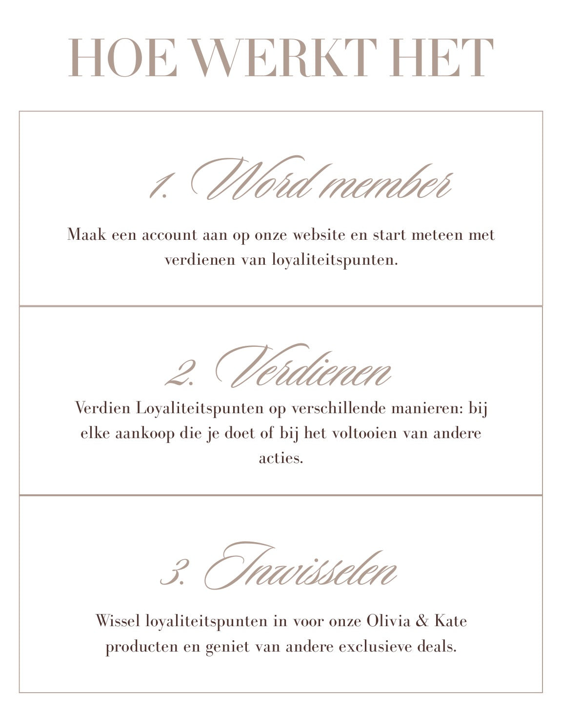 De O&K Member Club is onze manier om jouw loyaliteit aan ons te erkennen. Als member van de O&K Club spaar je automatisch punten en verdien je fantastische beloningen. Deze punten kunnen ingewisseld worden voor exclusieve Olivia & Kate producten.