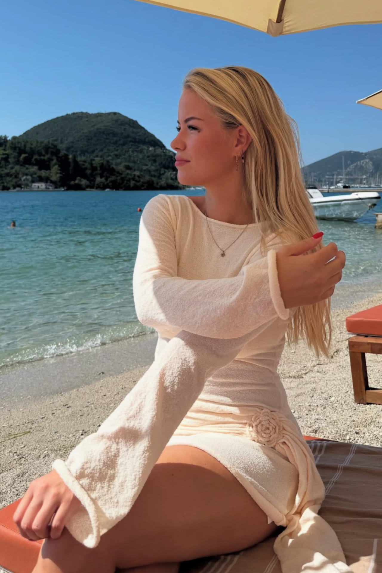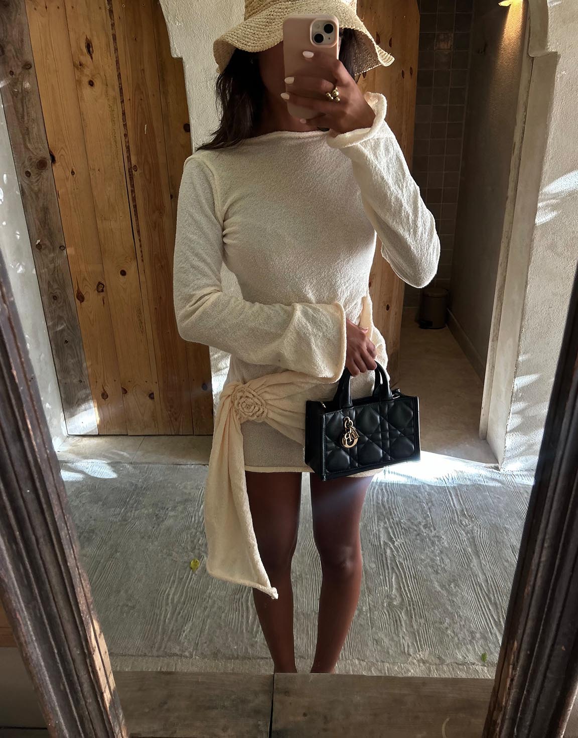 - Details: ribbed stretchy fabric / long sleeves / draped detail with rose