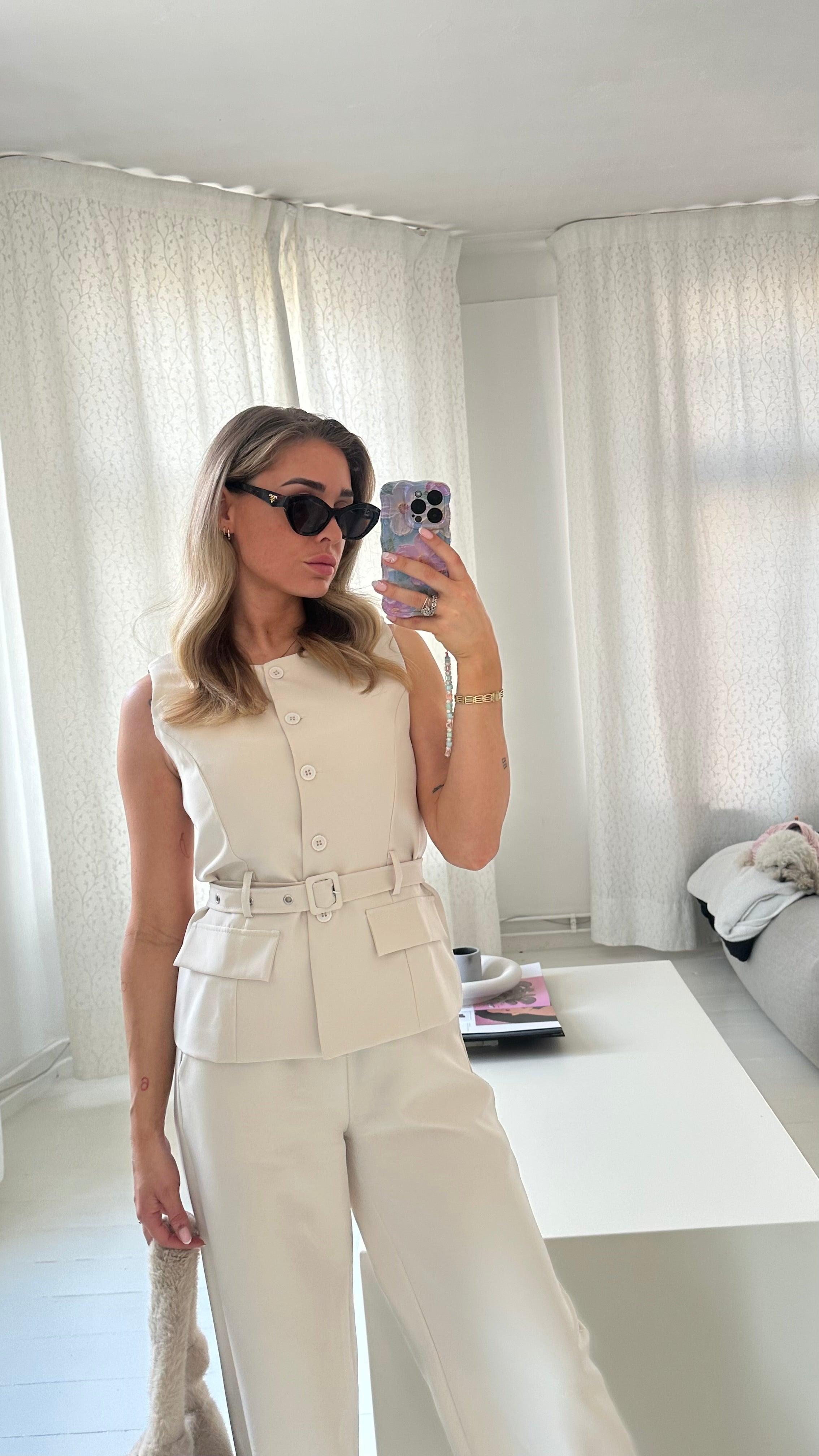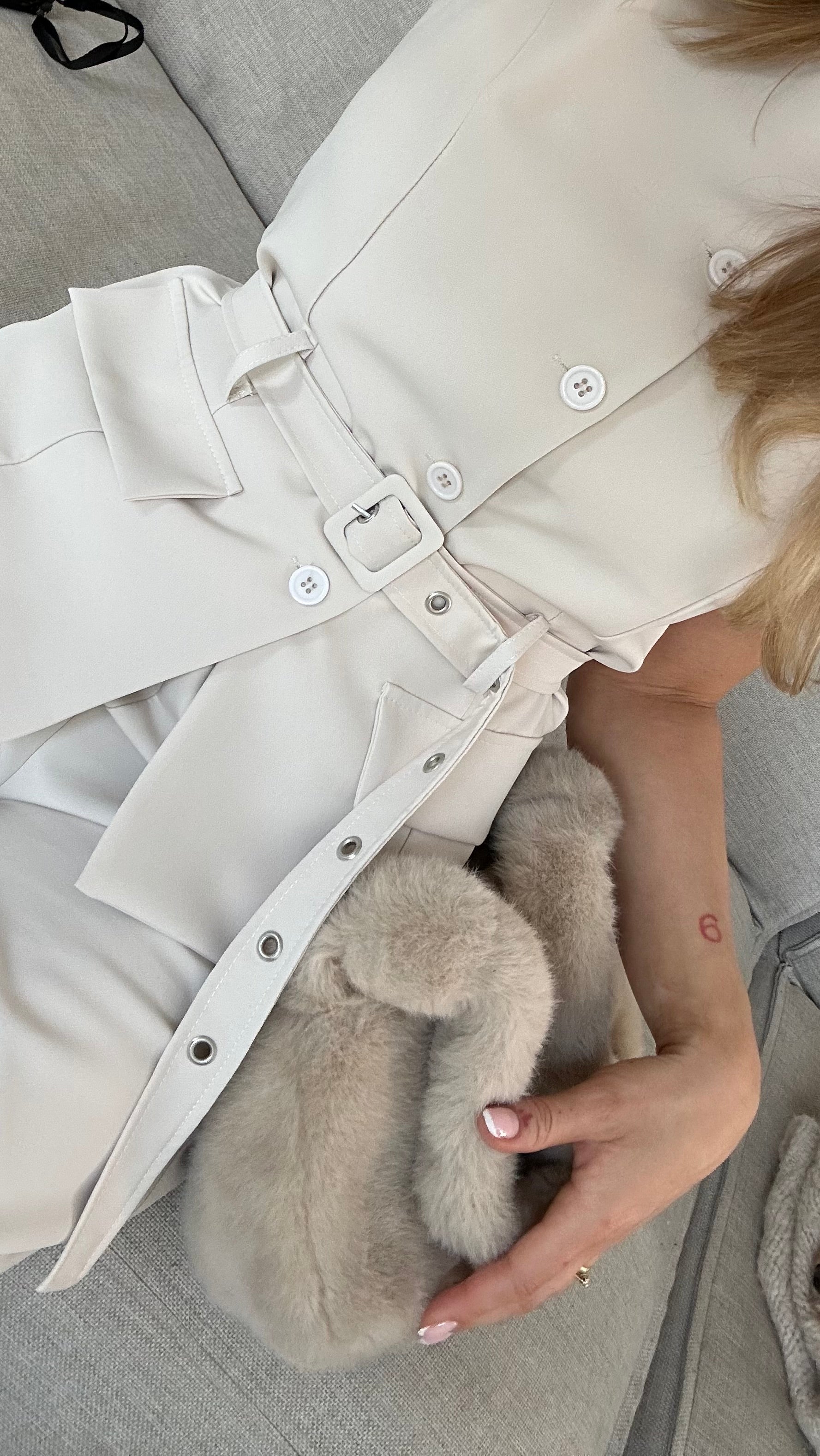 - Washing advice: hand wash- Tumble dry: no- Details: adjustable belt / buttons at the front / faux pockets / round neckline / belt loops