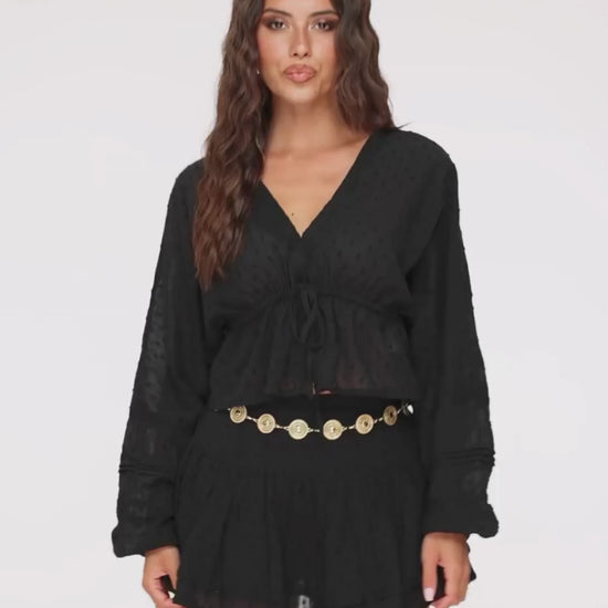 - Washing advice: hand wash - Tumble dryer: no - Details: V-neck / hook closure & button closure / bow tie at the front / detailed / elastic band / elastic sleeve ends - Model height: - Model wears: size