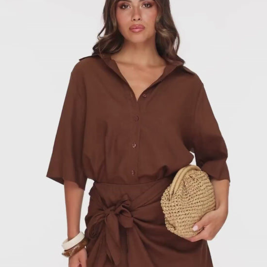 Blouse- Was advies: 30 graden- Droger: nee- Details: linnen / korte mouwen / hoge kraag / knoopsluitingen aan de voorkant - Model lengte: 173 cm- Model draagt: maat S