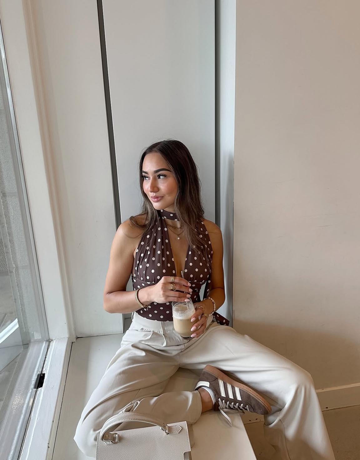 - Details: halter top / stippen print / striksluiting in nek / mouwloos / gevoerd / elastieken band