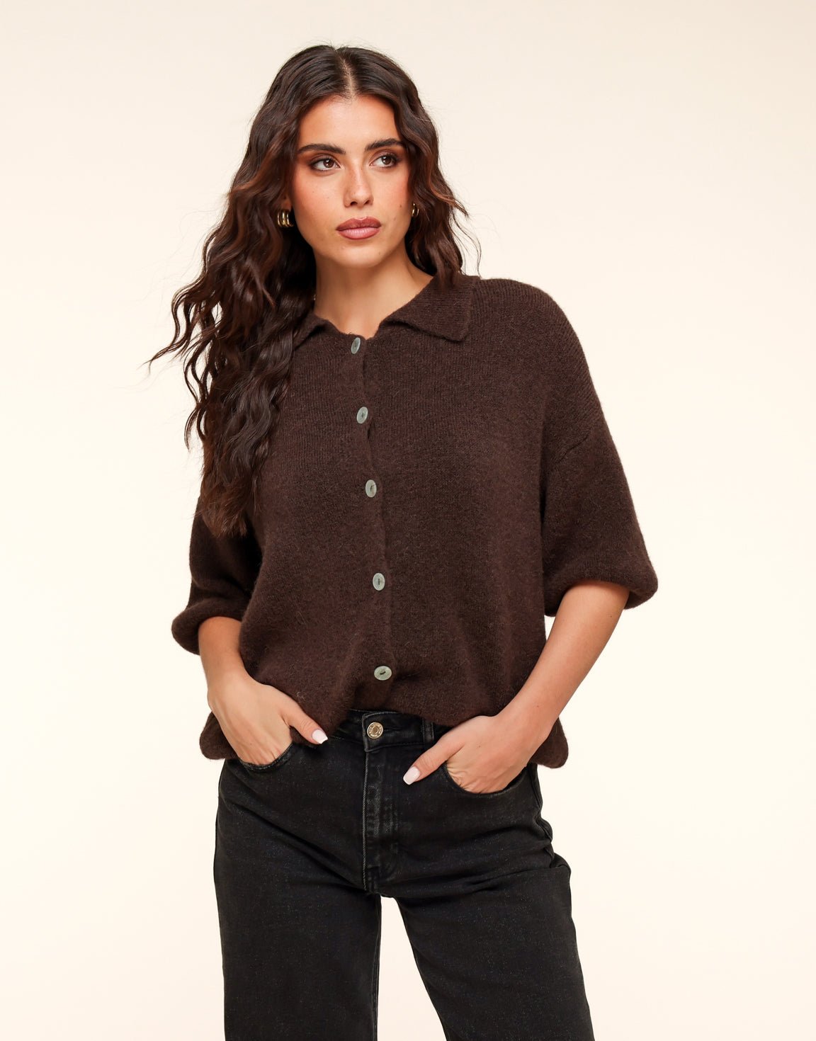 Art. Nr. :12742- Wasadvies: handwas- Droger: nee- Details: fluffy top / korte mouwen / stretchy / kraagje / knopen aan de voorkant- Model lengte: 173 cm - Model draagt: maat S/M