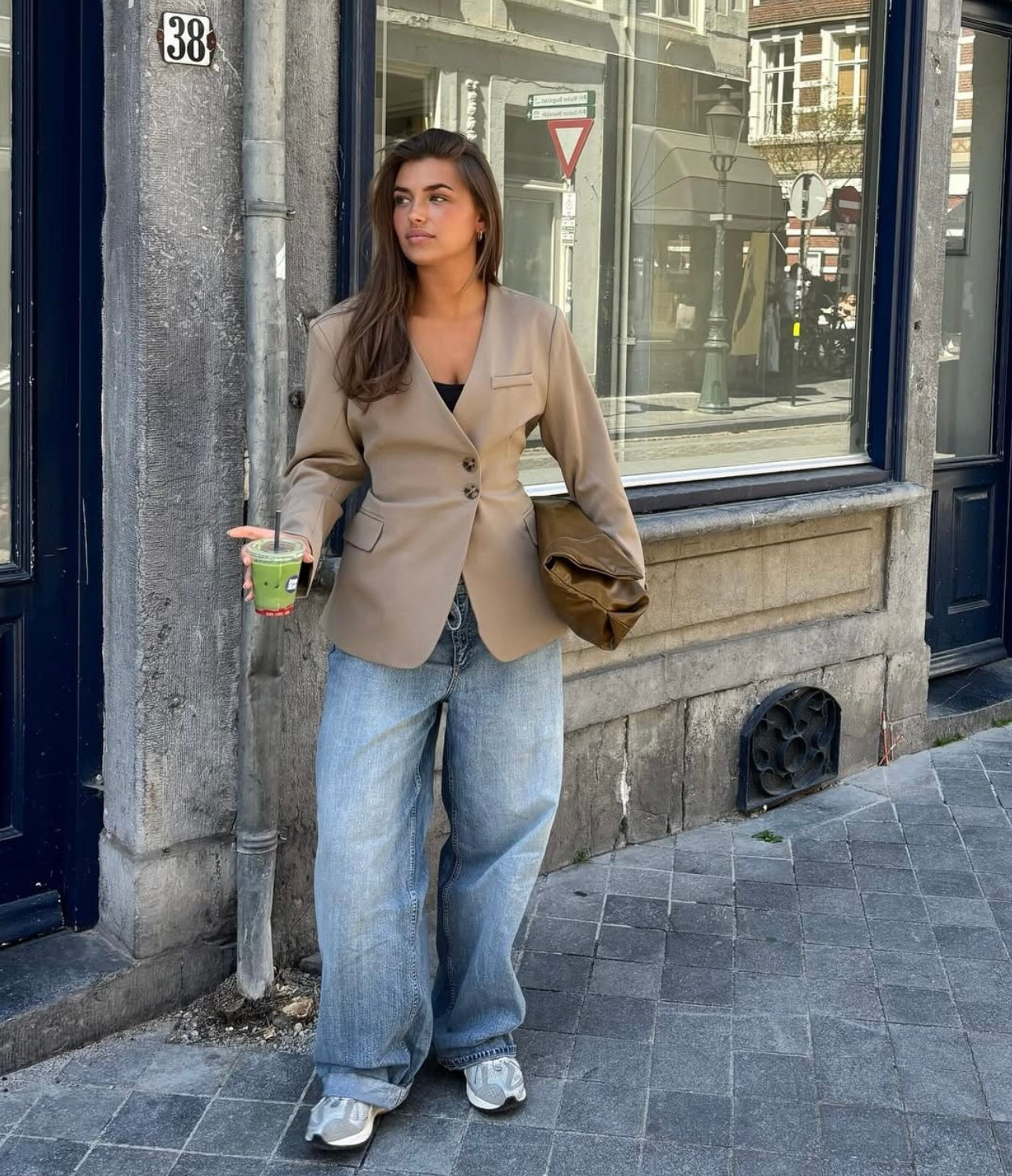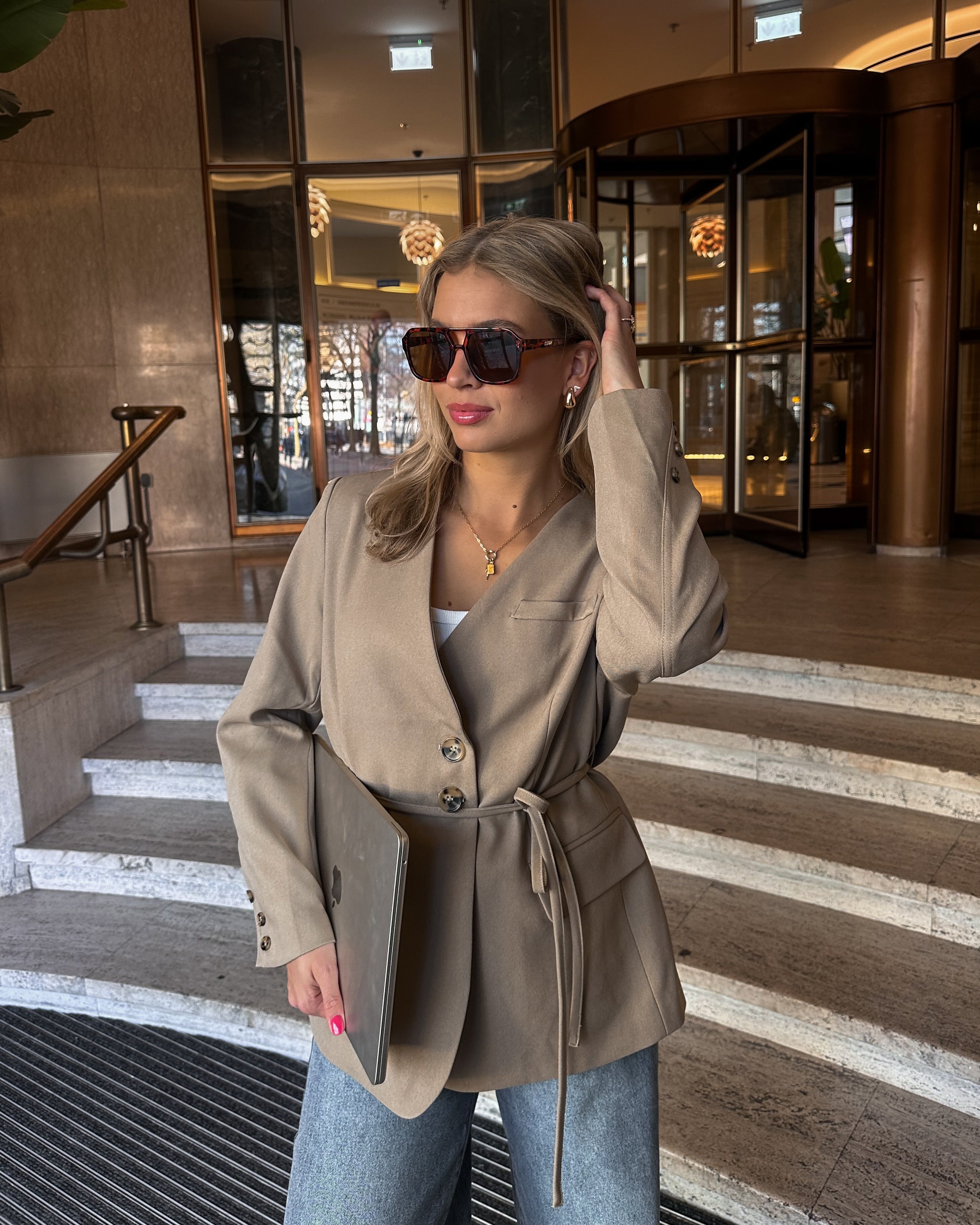 - Was advies: 40 graden- Droger: nee- Details: lange mouwen / schouder pads / twee zakken aan de voorkant / knoop details op de mouwen / strap om om te wikkelen om de blazer / oversized fit- Model lengte: 173 cm- Model draagt: maat S/M