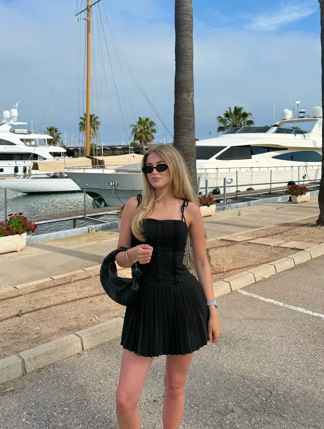 - Details: corset model jurk / mouwloos / strikjes bandjes / ristsluiting aan achterkant / geplooide rok / corset-bh haakjes aan de voorkant
