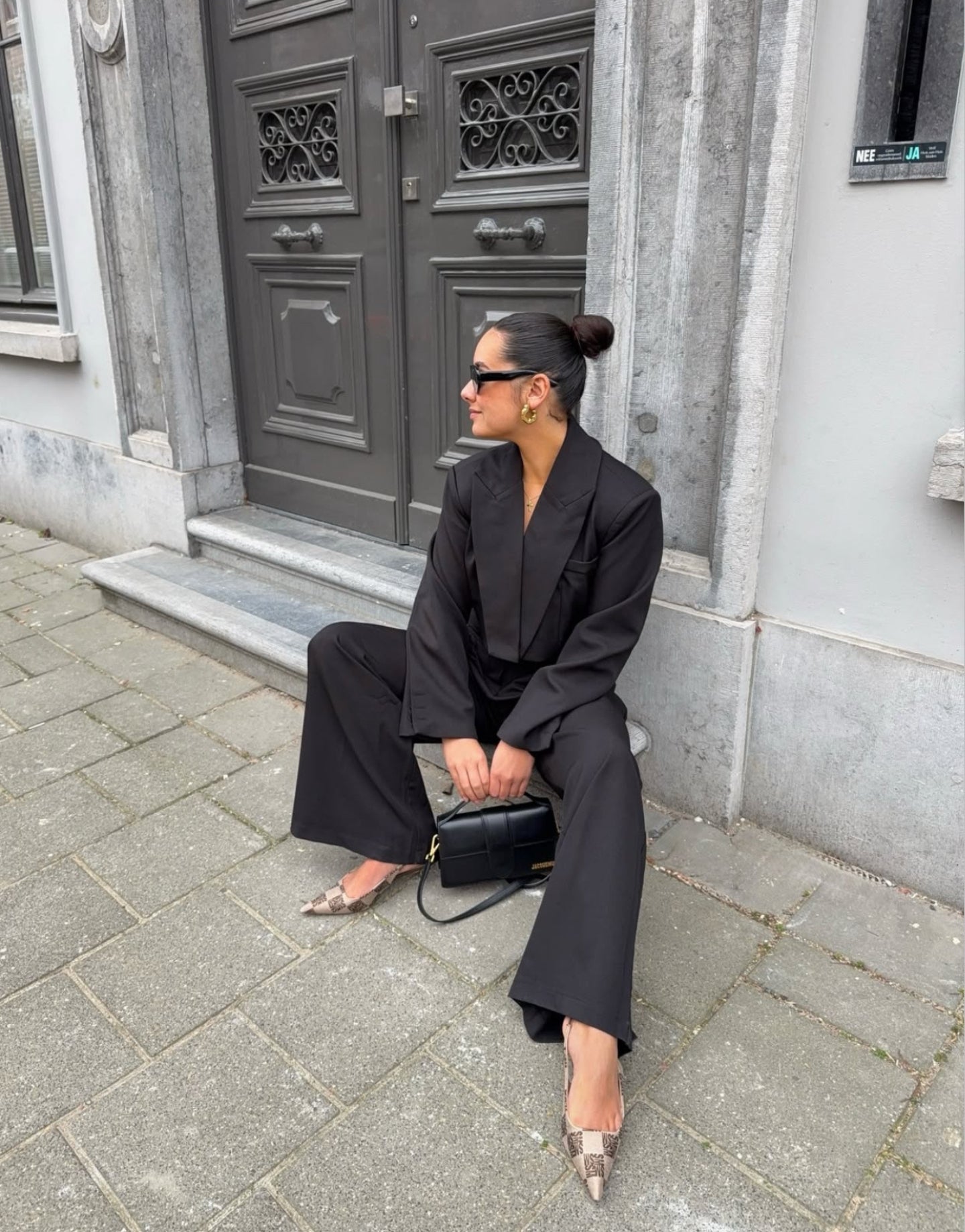 - Was advies: handwas- Droger: nee- Details: cropped model / lange mouwen / druk knoop sluiting / knoop detail op de mouw / schoudervullingen - Model lengte: 175 cm- Model draagt: maat S